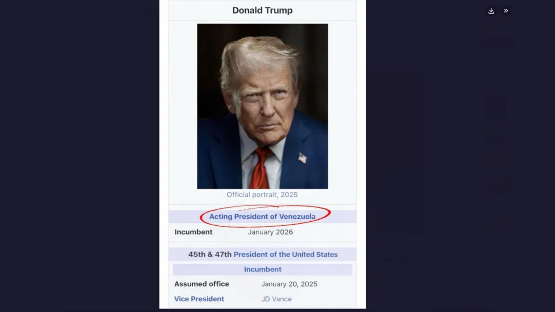 نشر الرئيس الأميركي دونالد ترامب منشورًا على منصة “تروث سوشيال” أعلن فيه نفسه حاكمًا مؤقتًا لفنزويلا، مرفقًا بصورة له مأخوذة من موقع “ويكيبيديا”.